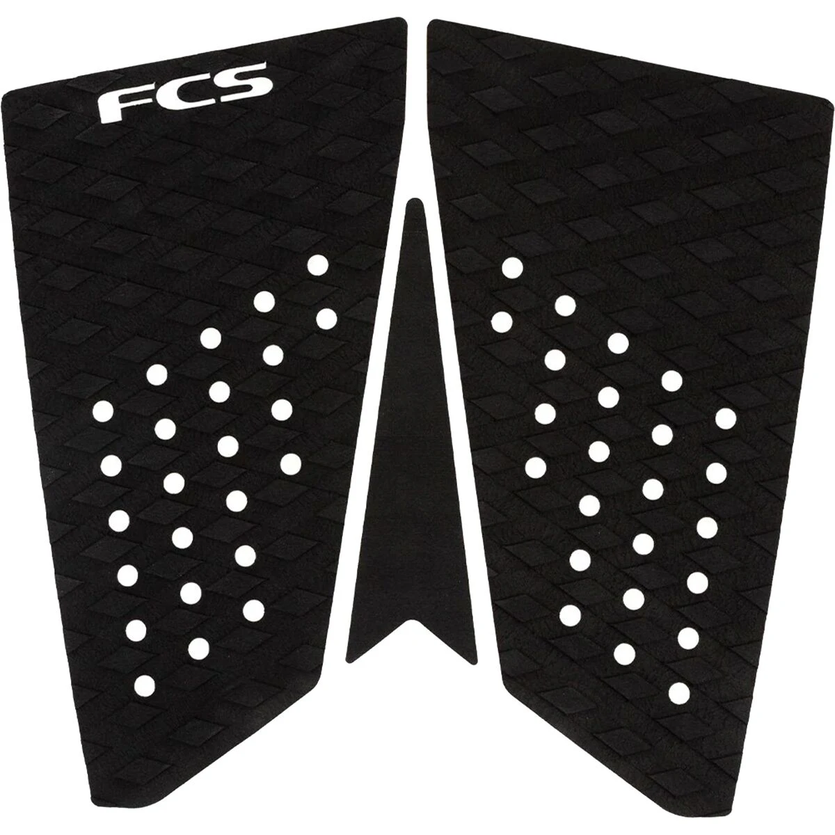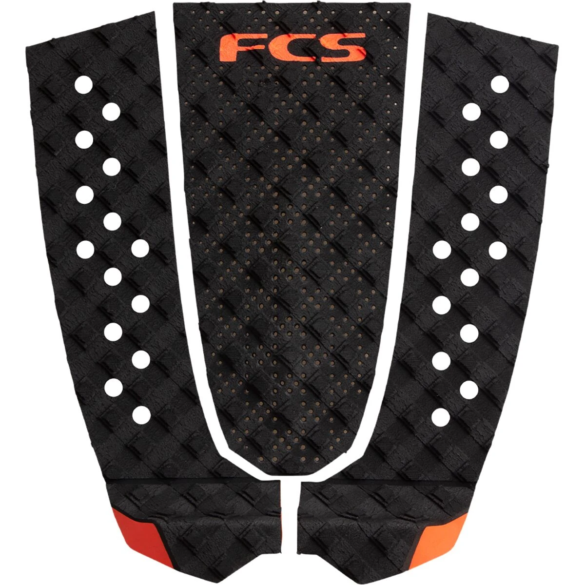 Featuring a well-spaced gridlock groove pattern and deep toe channels for maximum grip, the FCS T-3 Traction Pad delivers sure-footed traction for snappy bottom turns and steep drops. This three-piece traction pad features a thermoformed dimpled surface for high levels of overall stability and grip. Additionally, the defined spine arch and Luna rounded performance kick make for a more aggressive, highly responsive feel.
