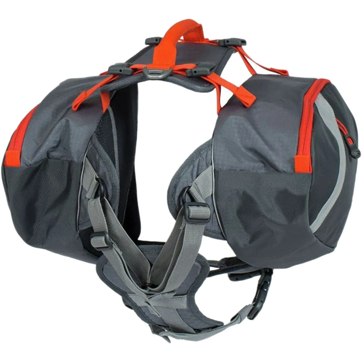 - Pannier-style pack stores gear for trail dogs