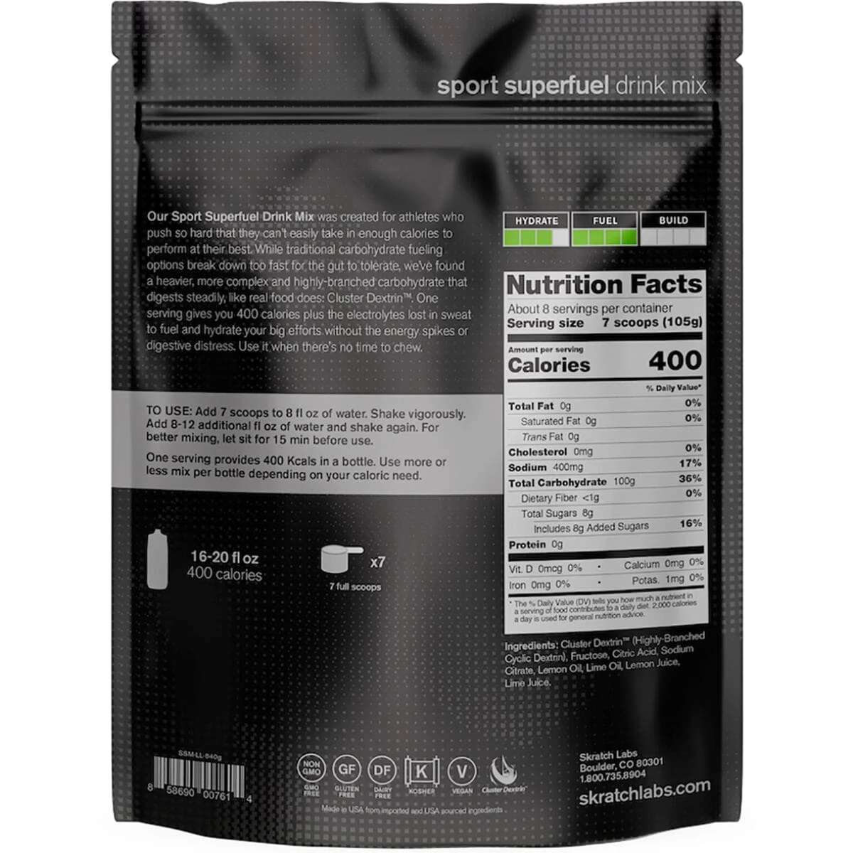 When you are spending countless hours a day training for your next big race, ensuring you are eating and drinking enough is huge. Eating consistently throughout the day is the most ideal, but we also know how difficult that can be to keep up with, so Skratch Labs brings us the Sport Superfuel Drink Mix. In just one serving of Superfuel, 400 calories of carbohydrates and electrolytes are gained. The carbohydrate of choice for this drink mix is Cluster Dextrin, an option that digests most similarly to real food, avoiding causing any gastrointestinal distress usually brought upon by traditional sports drinks and gels. The Sport Superfuel Drink Mix is easy to add to your water bottle before you head out for your workout, saving you time and chewing energy.