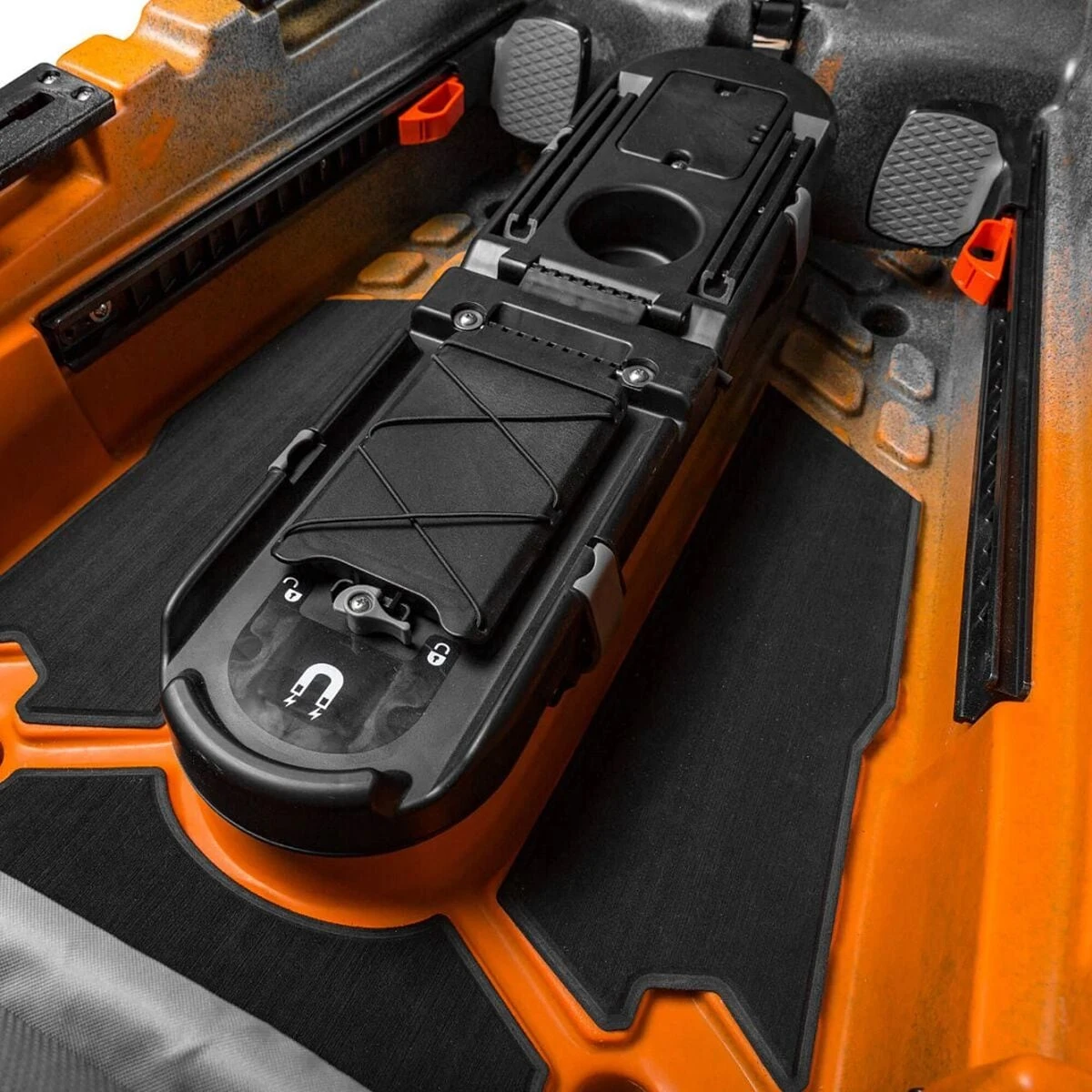- Center console mod pod includes two containers, accessory tracks, a cup holder, and splashproof storage