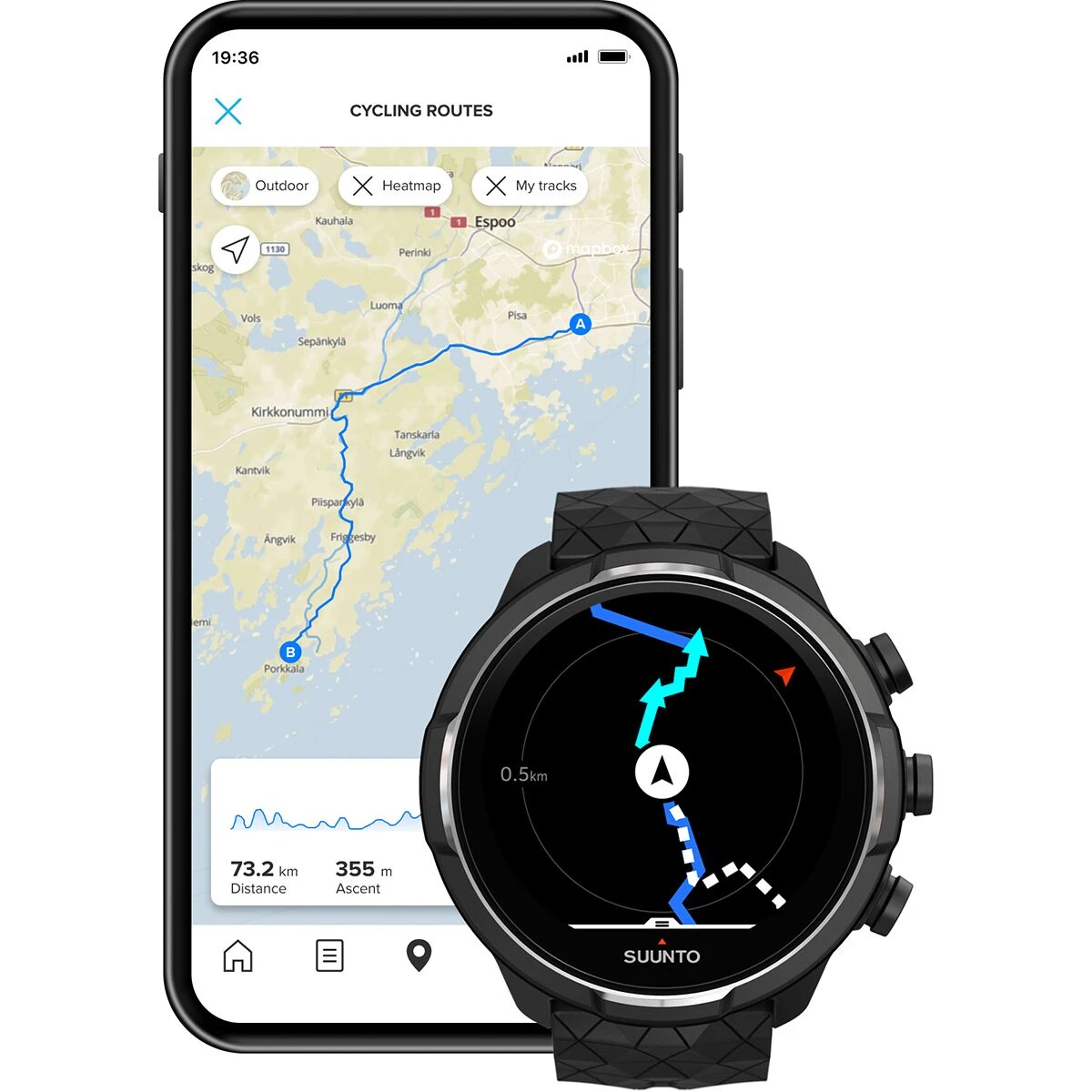 One of the most innovative parts of the Suunto 9 is how it uses both GPS and movement data to preserve battery life and keep accurate tracking. GPS is a big drain on batteries, so when batteries start to drain the GPS signal is often reduced to preserve juice, resulting in incorrect readings. The Suunto 9 gets around this problem by using movement data to fill in the gaps when GPS is limited, giving you an accurate distance reading that won’t cause your battery to sputter out halfway through your run. The Baro edition of this watch uses similar technology to measure altitude, combining GPS altitude with barometric altitude for a highly accurate reading when you’re tracking your elevation gains. The Suunto 9 Baro also delivers outdoor insights like sea level pressure and temperature, and even features a storm alarm to let you know when you should be picking up the pace or ducking for cover, all of which can be displayed with their Outdoor watch face for easily accessed information. You’ve got all of this, plus over 80 specific sport modes, 100m water-resistance, a wrist heart-rate monitor, and a stylish Titanium bezel for unrivaled durability and eye-catching looks.