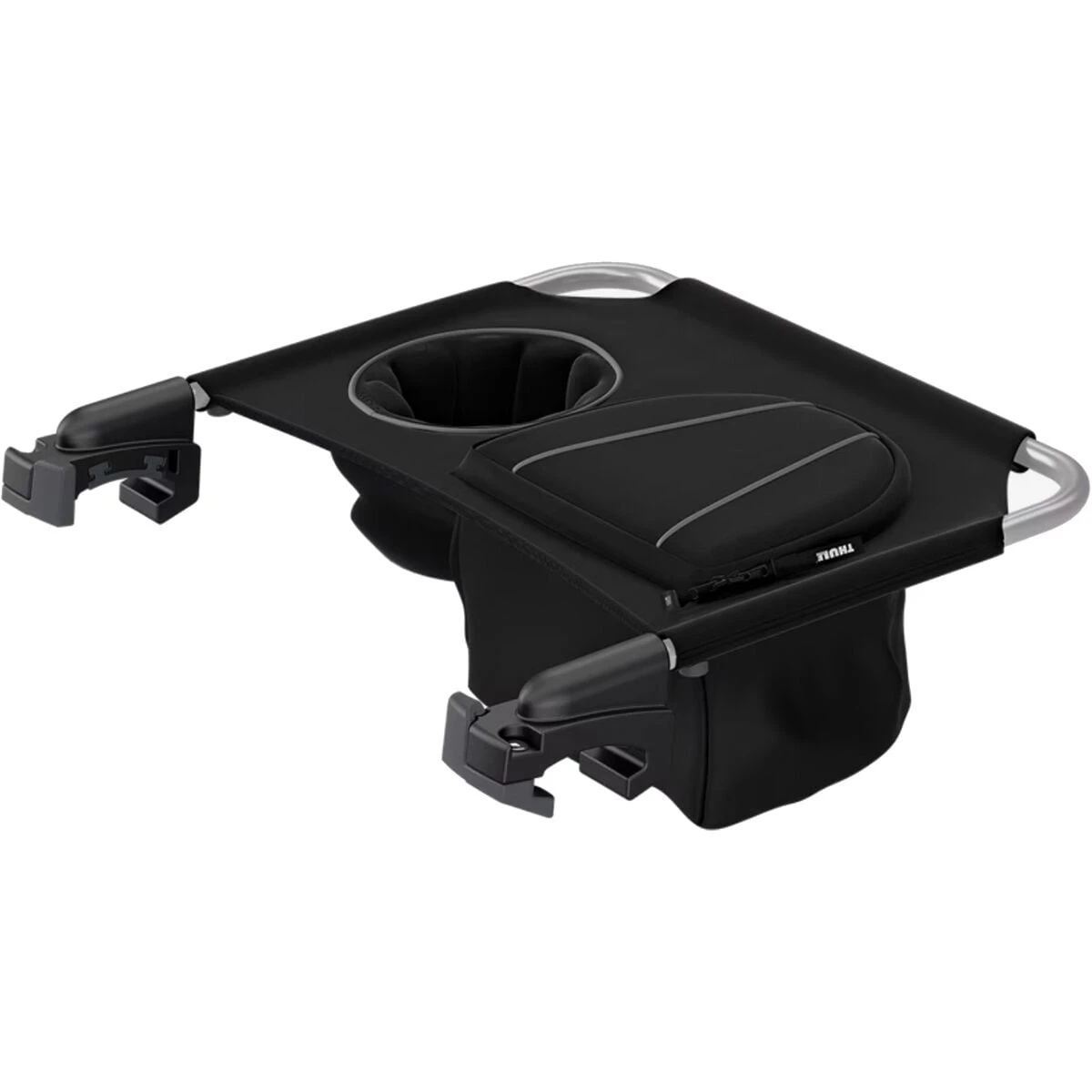 Add a zippered pocket and built-in cup holders to your Thule double child carrier.